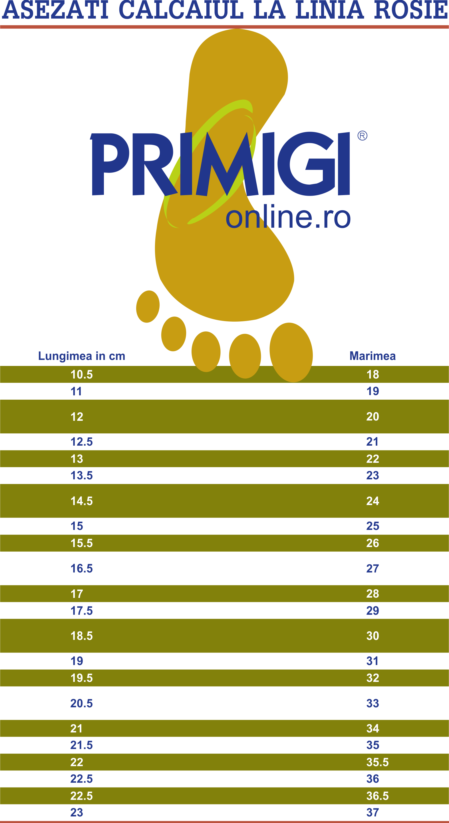 Pentru incaltamintea Primigi, lungimea talpii interioare va avea cu 1/2 cm mai mult pentru creşterea piciorului. Astfel, daca dimensiunea obtinuta de dumneavoastra prin masurare este de 10, 5 cm, brantul interior al incaltamintei Primigi va avea pentru numarul 18 (de altfel corespondent in diagrama) 11cm (cu 0,5 cm mai mult). Nu este recomandata purtarea unei perechi de incaltaminte cu 2 numere mai mari (1 cm). Marimea determinata astfel prin compararea cu diagrama de mai jos va fi cu siguranta cea corecta.